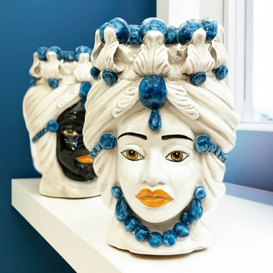 Testa di Moro Donna Altezza 30 cm con Decoro Blu in Ceramica