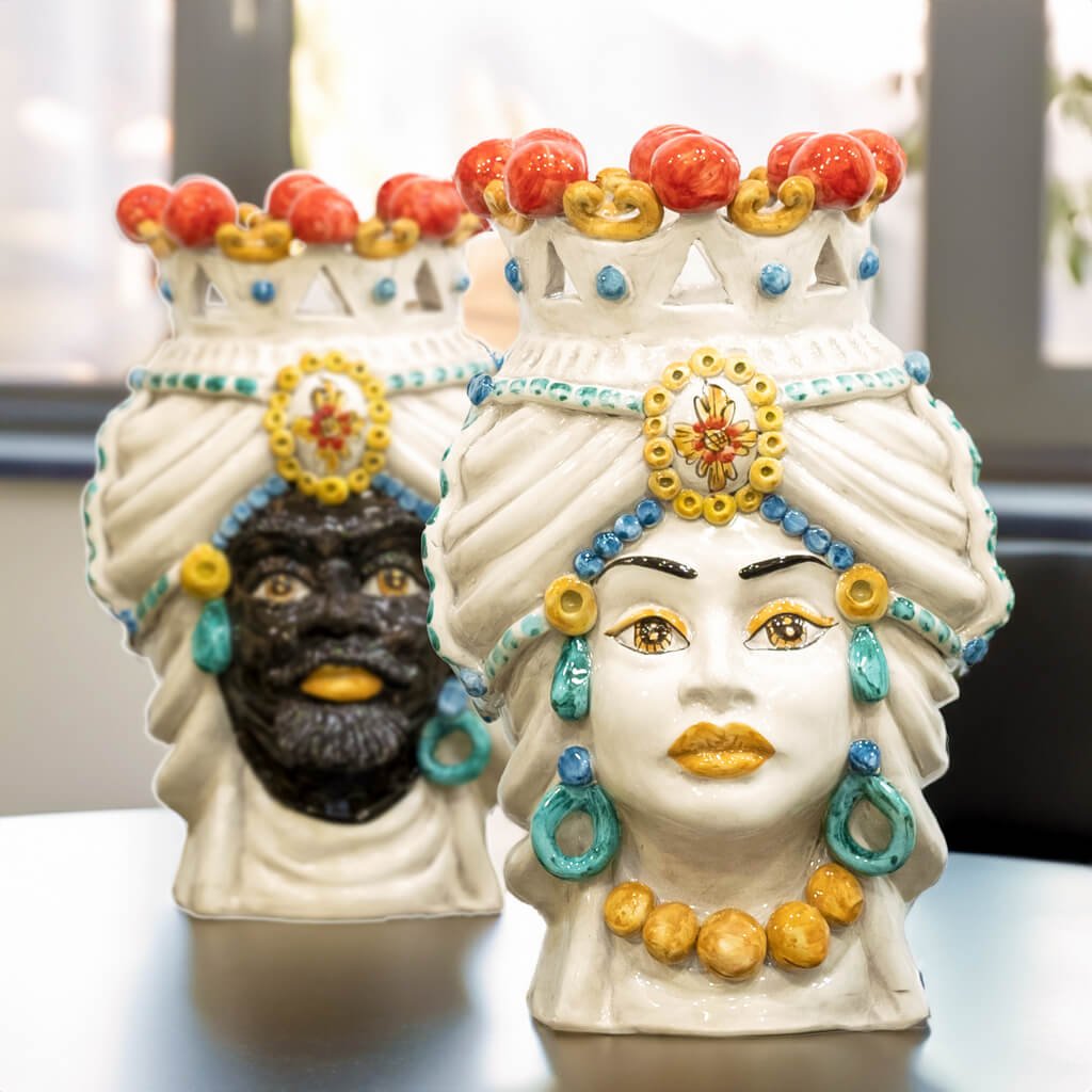 testa di moro regina in ceramica di Caltagirone modellate e decorate a mano; per uno stile classico e tradizionale, legato alla storia della sicilia, a quello più attuale dedicato all’interior design moderno.